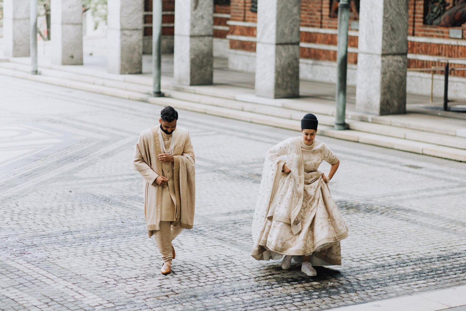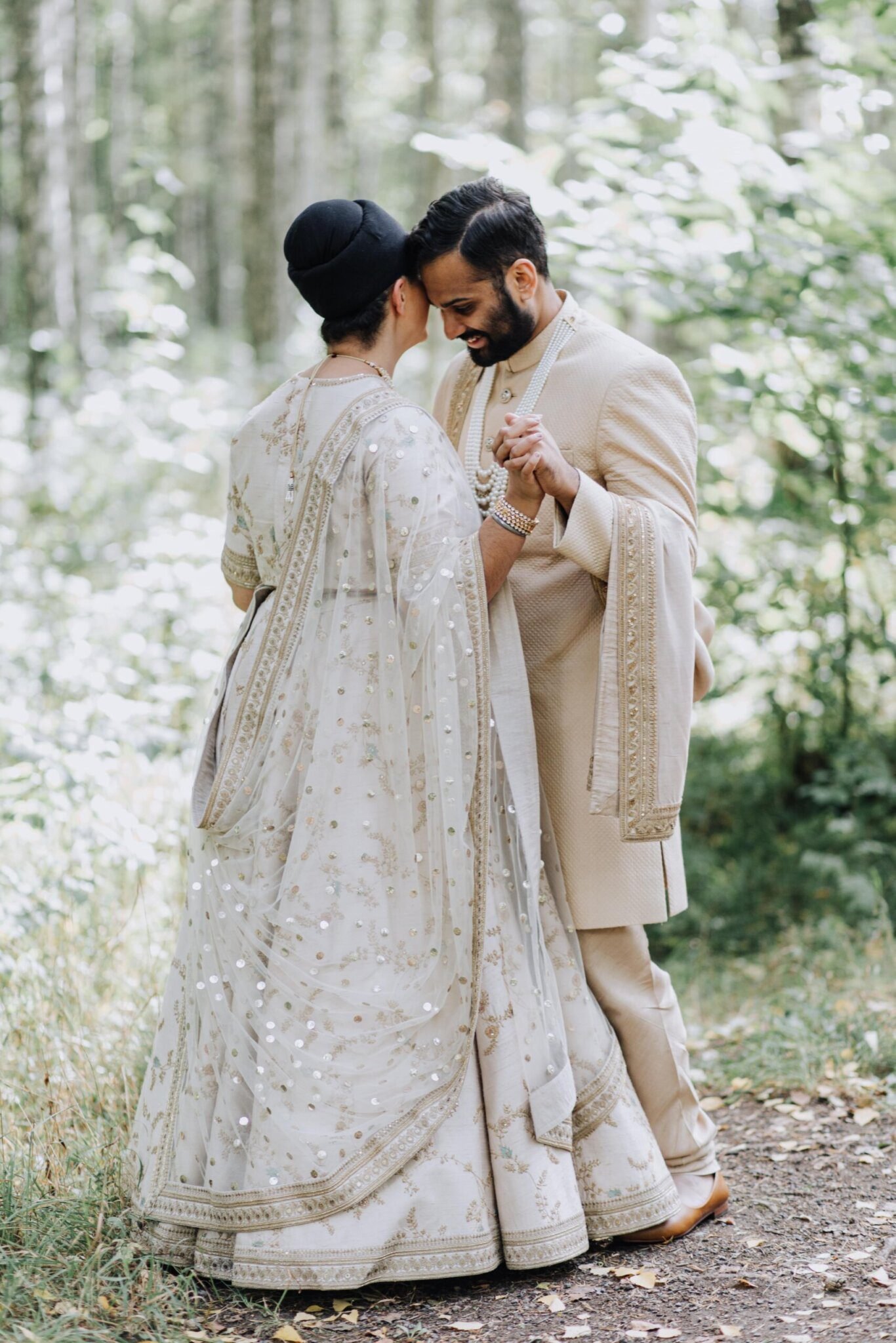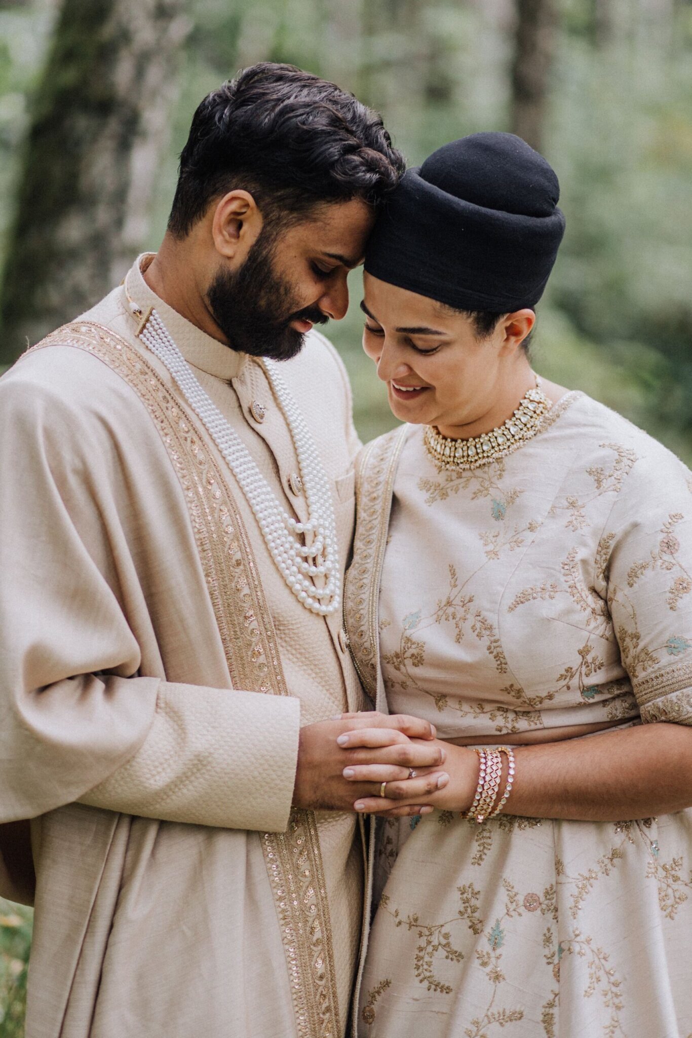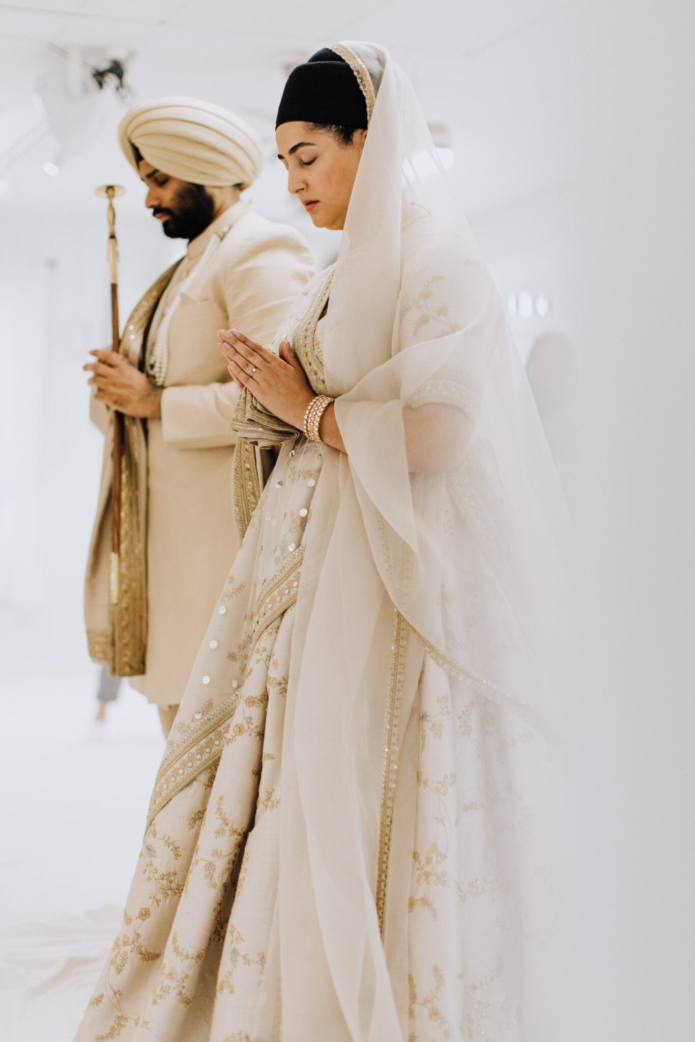 a turban, usually a male enclave. It serves as both a way of life and a symbol of personal faith for her. In a rare minimalist Sabyasachi silk lehenga, Prableen looked striking while Nirusan aced a Sabyasachi sherwani.